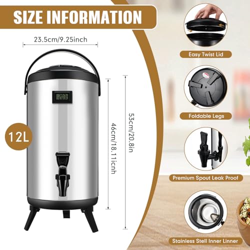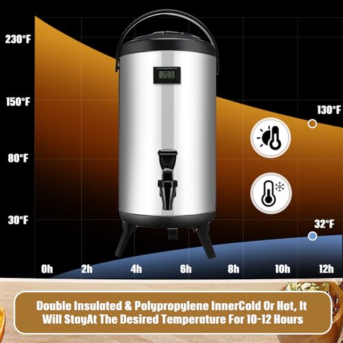 Specification: Hushee 12L 3.2 Gallon Stainless Steel Insulated Beverage Dispenser with Thermometer Thermal Thickened Ice Tea Hot Drink Dispenser with Spigot Hot Water Urn for Cold Milk, Coffee, Juice, Silver