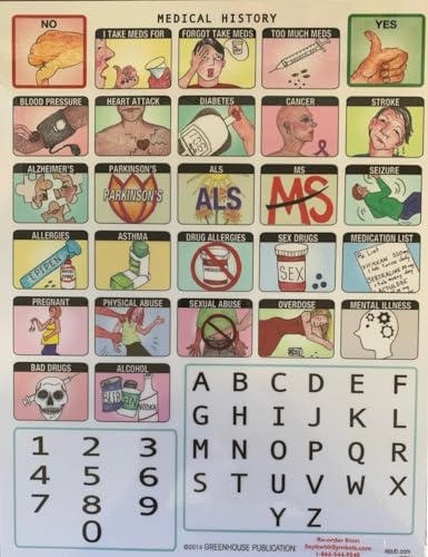 Covers Many Topics EMTs Wish to Know – The boards feature 50, hand-drawn, colorful icons depicting a patient’s MAIN COMPLAINT, TYPE OF PAIN and MEDICAL HISTORY. The front side, top-half features MAIN COMPLAINT ICONS with a clock for TIME questions and answers. The bottom-half highlights icons for TYPES OF PAIN and a pain scale in the bottom corner. The backside features icons of one’s MEDICAL HISTORY including medications, ailments and diseases, a number board and an alphabet for spelling. Includes alphabet and numbers to help resolve the what, where, when and why of a patient’s medical issues.