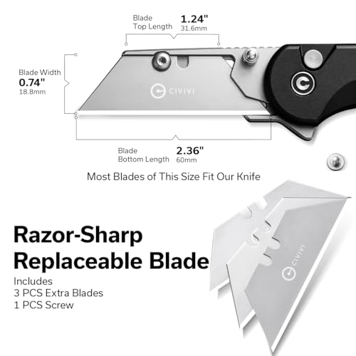 Razor-Sharp Replaceable Blade — Equipped with 3PCS sharp blades and 1PC screw, the folding utility knife ensures easy blade replacement. With dimensions of 1.24 inches (top), 2.36 inches (bottom), 0.74 inches wide, and 0.02 inches thickness. Most Blades throughout the mentioned dimension is compatible.