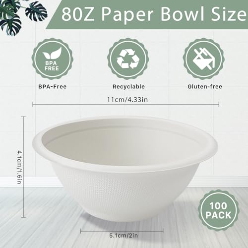 Specification: 100 Pack 8oz Disposable Paper Bowls,Small Disposable Bowls,Eco-friendly Natural Bagasse Bowls,Paper Bowls Heavy-Duty, 100% Compostable Bowls,Biodegradable Soup Bowls for Salad, Snack,Dessert