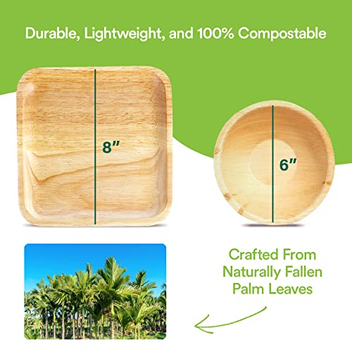 Dinnerware Set: 70 Count Dinnerware set which includes 50 pieces of Compostable 8 inch Palm Leaf Square Plates & 20 pieces of 6 Inch Round Bowls, It can also be used as Party Pack Set.