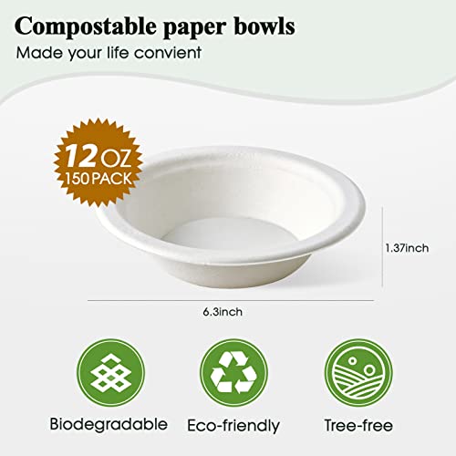 ECOLipak 150 Pack Paper Bowls Disposable 12 oz Compostable Bowls, Heavy duty Biodegradable Bowls, Eco Friendly Sugarcane Bagasse Bowls Great for Soup, Salad, Milk Cereals
