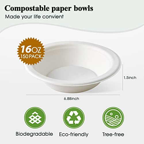 ECOLipak 150 Pack Paper Bowls Disposable 16oz Compostable Bowls, Heavy-duty Biodegradable Bowls, Eco-Friendly Sugarcane Bagasse Bowls Great for Soup, Salad, Milk Cereals…