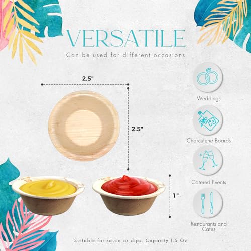 LEAFIQUE 2.5 inch / 1.5 Oz Palm Leaf Bowls for Dips, Sauces & Charcuterie – Bulk 100 Set | Better Than Bamboo Bowls & Paper Bowls | Heavy Duty Disposable Bowls | Untreated Palm Leaf Bowls For Rabbits