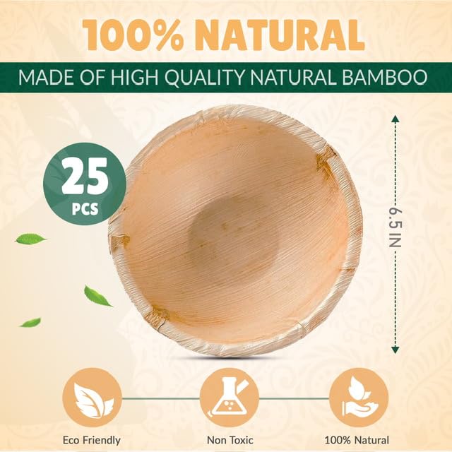 Palm Leaf Bowl 6.5 Inch Bamboo Bowl Disposable 25 Pack Bulk Eco-Friendly Biodegradable Compostable Plates Best Alternative To Wooden Plastic Paper Plates
