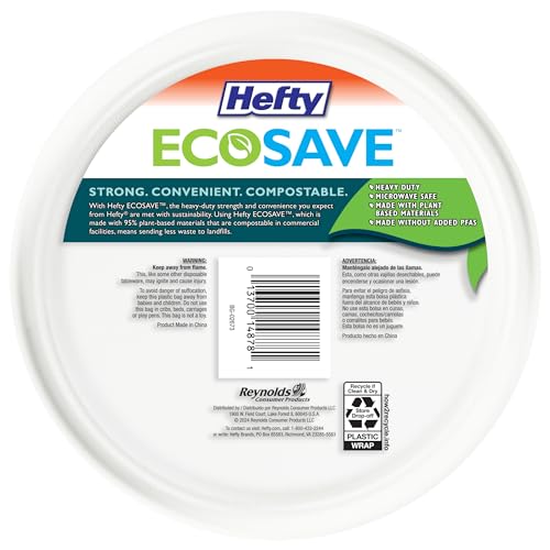 Hefty ECOSAVE Compostable Plates make cleanup easy. Made without added PFAS and with durable and microwave-protected plant-based material, these disposable plates are compostable in commercial facilities. Load up these large paper plates with casserole, mac and cheese, ribs and more; signature strength delivers the heavy duty quality you’ve come to expect from a Hefty plate. Don’t disregard: all Hefty products are backed by a 100% satisfaction guarantee. Hefty ECOSAVE Compostable Plates make clean-up easy.