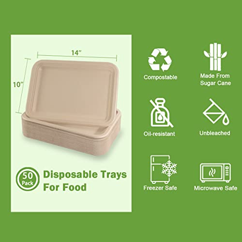 WDF 50 Pack 14 Inch Food Trays Disposable – 100% Biodegradable Compostable Heavy Duty Food Serving Trays, Extra Large Paper Plates for BBQ,Lobster, Seafood Boil Party Supplies
