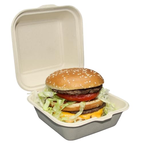 Biodegradable To Go Food Containers – Heavy Duty Disposable Clamshell Take Out Boxes with Lids. Designed for Restaurant Delivery or Home (6X6 Clamshell Container 100pck)