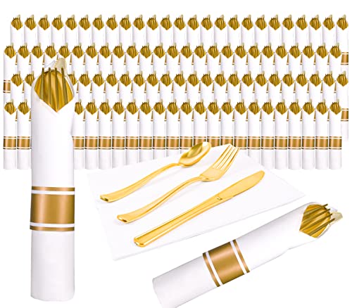 100 Pre Rolled Gold Plastic Silverware – Wrapped Plastic Cutlery with Napkin, Disposable Flatware Set Include 100 Forks, 100 Knives, 100 Spoons and 100 Napkins, Gold Utensils for Party, Wedding