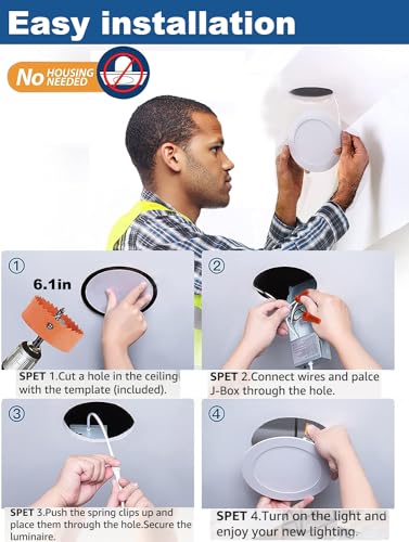 💡【Easy Install】The low profile recessed lighting is suitable for retrofit and new decoration: Cut a hole in ceiling with The use of a 6.1 inch (155mm) diameter hole opener; Connect the Jbox to the cable; Use spring clip to fix it at the ceiling. Hassle-free, the installation may also be completed in minutes.