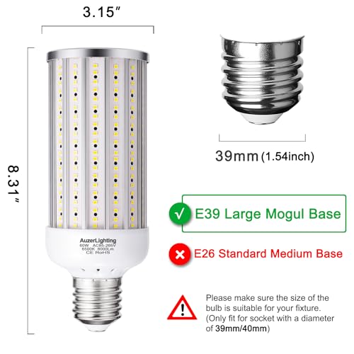 Specification: 60W LED Corn Light Bulb, Large Mogul E39 Base, 6000-Lumen, 6500K Daylight Cool White,LED Bulb for Factory Warehouse Barn Garage Shopping Mall Supermarket Large Area AC85V-265V